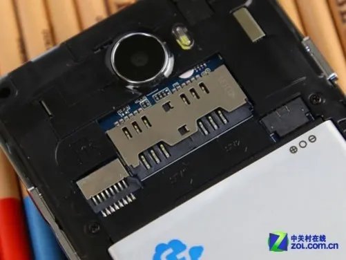 MicroSD卡SIM卡插槽 打开后盖,基伍A800的电池仓布局非常规正,电池上方最左侧是一个MicroSD卡插槽,支持最高32G扩展,右侧分别是SIM卡1和SIM卡2插槽,这也表明该机支持TD-SCDMA+GSM双卡双待,并且TD-SCDMA网络让中国移动用户不换换号即可享受3G网络的速度,这一点对于中国移动的用户来说绝对是个好消息。