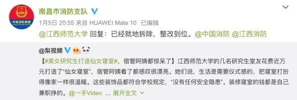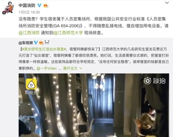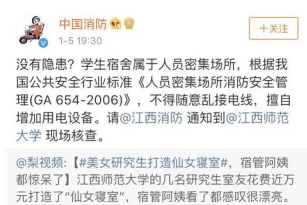 因为就在大家疯狂转发和评论的时候,这个寝室也受到消防救援局官方微博的关注,并且应急管理部消防救援局官方微博“中国消防”转发这个仙女寝室相关视频,很确切的指出这样的改造是存在消防隐患的,不得随意乱接电线,擅自增加用电设备,并且称虽然并不是说所有的隐患都会造成事故,但房间内确实存在隐患。要求这个仙女寝室进行拆除、整改。